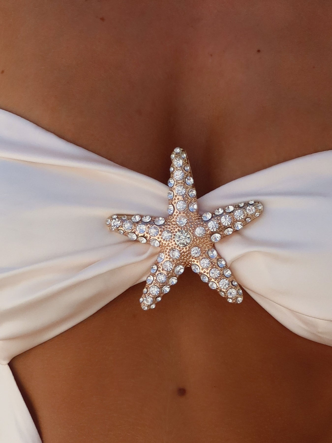 Meet our Agnes Mini Dress in Ivory, a statement piece that turns heads! Crafted from satin fabrication, she features an off-shoulder neckline, sculpted bodice, and an asymmetric waist cut-out that flatters the figure. Crystal-encrusted starfish embellishments accent the bust and hip, while the open back is finished wit
