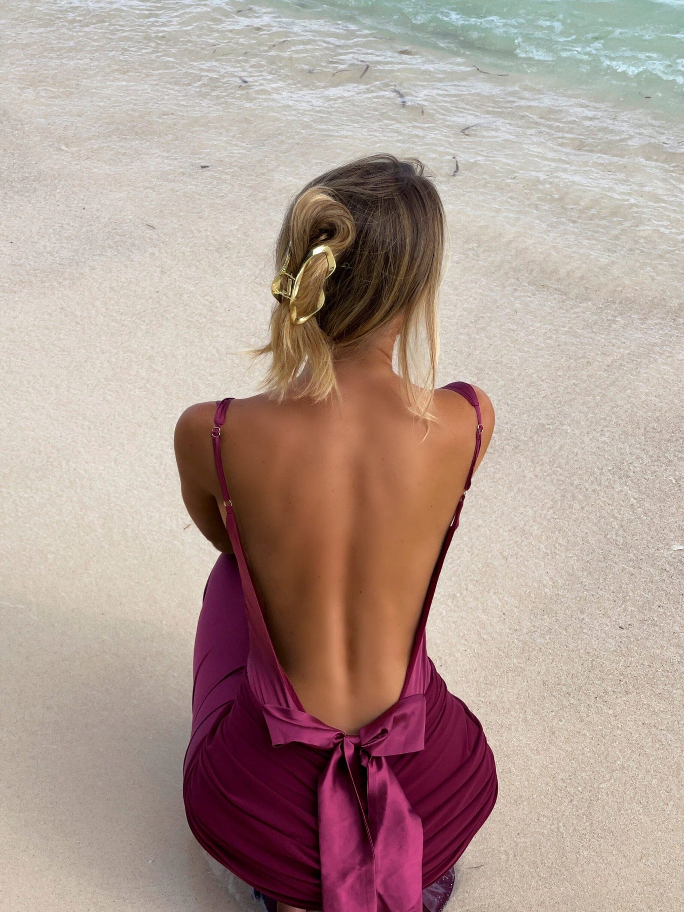 Meet the refined and alluring Breanne Maxi Dress in Burgundy. Designed in rich burgundy satin with a georgette gathered overlay, this maxi contours the body with built-in boning for a sculpted fit. A plunging neckline and ruched detailing at the waist enhance the silhouette, while the open-back design is finished with