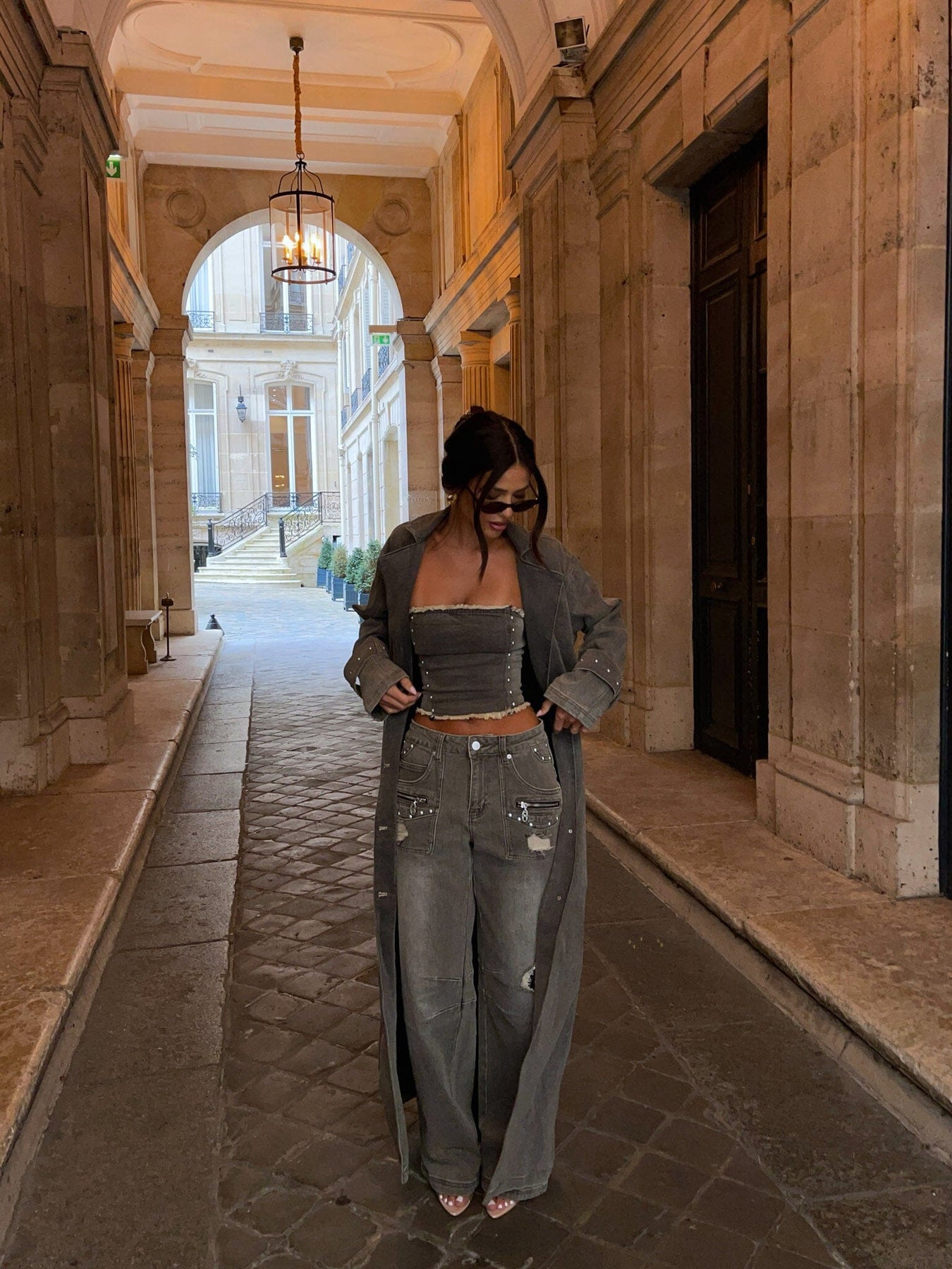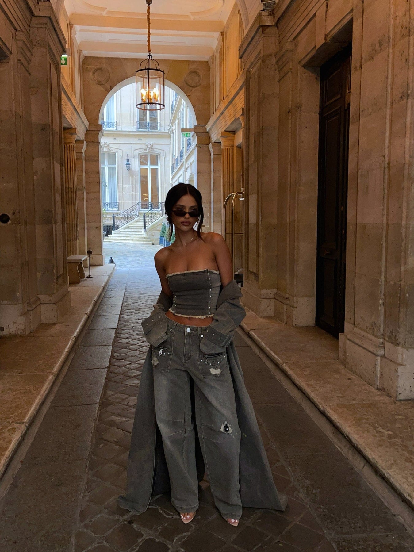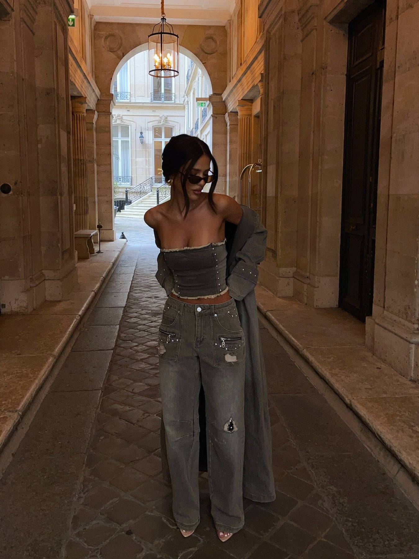 Elevate your wardrobe with the bold and edgy 'Hendra Top' in Denim! This statement piece is crafted from stretch denim for a comfortable yet structured fit. The strapless neckline and raw-edged hemline exude effortless style, while silver stud details add a touch of rebellious glamour. Designed with a corset-style bodi