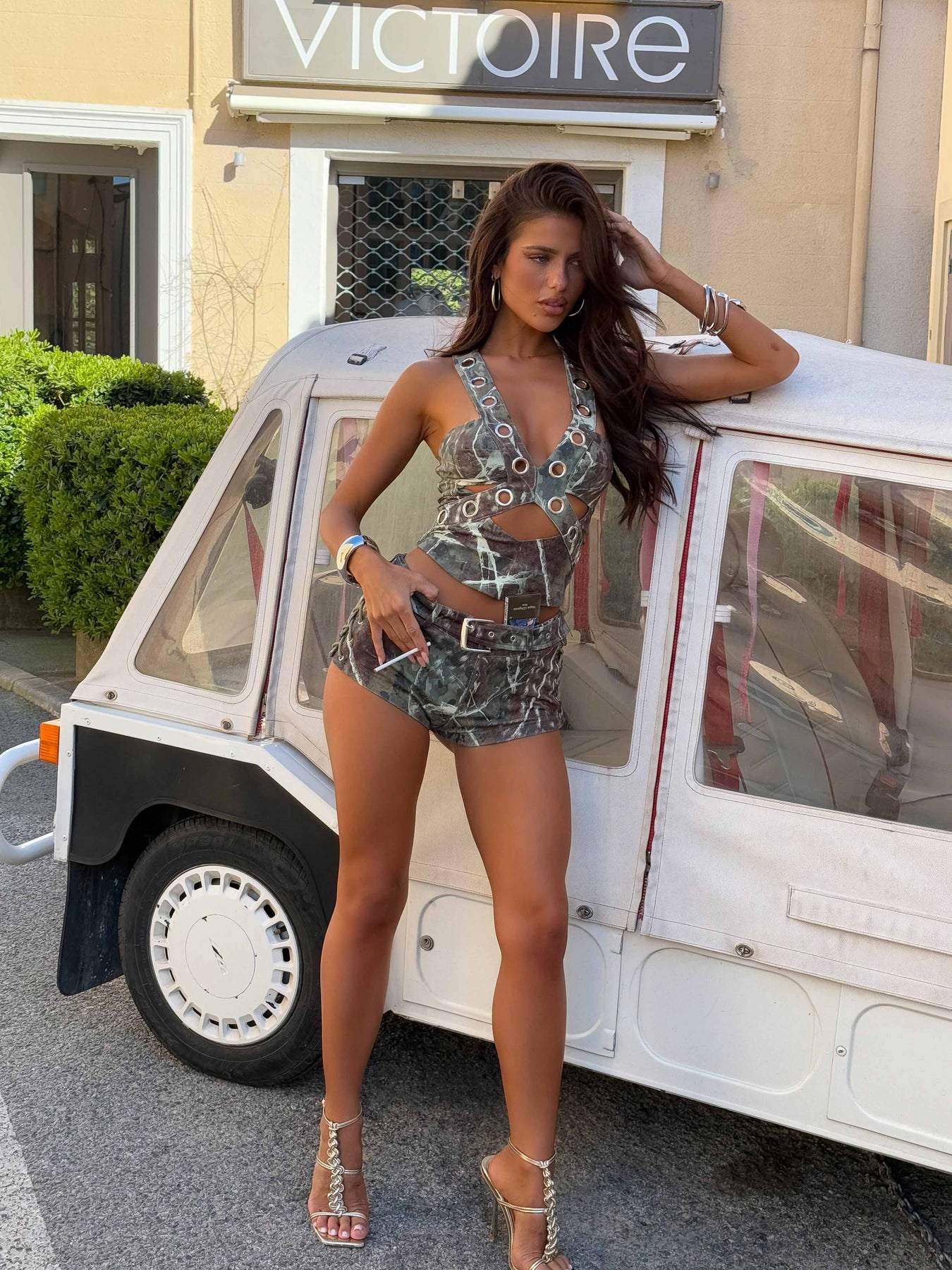 Turn heads wearing our Oliviae Top in our Outcast exclusive Hunter print! Crafted from a stretch woven fabrication in our custom print, this cropped halter is made to turn heads. Featuring bold silver eyelets, a plunging neckline that can also be worn as a criss-cross design and lace-up detailing at the waist. Oliviae