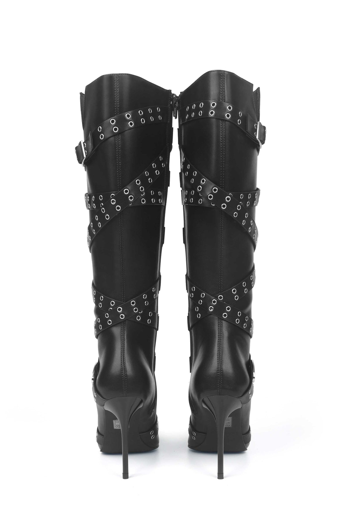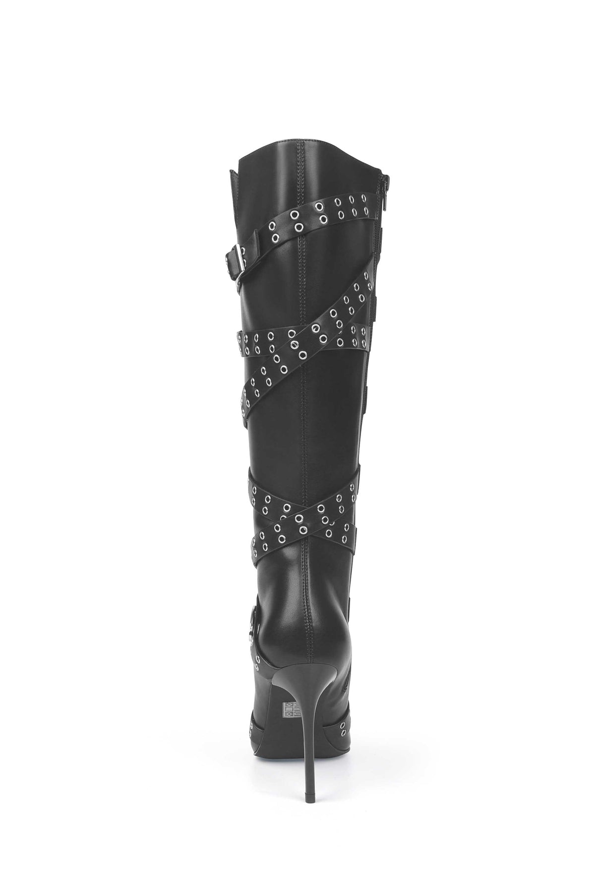 Introducing our statement black knee-high boot! Our 'Zaneta PU Boots' were made to make an impact!  Crafted from a PU leather, Zaneta is designed with a pointed toe, sleek stiletto heel and has a zipped on the inner of the boot for easy on-off. Zaneta has wrapped around strapping that is detailed with silver eyelets an